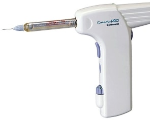 強い力で一気に歯肉に麻酔液が入ると急激な痛みが発現するので、電動注射器により麻酔液の流入するスピードを一定にコントロールし、ゆっくり少量ずつ麻酔液を注入します。