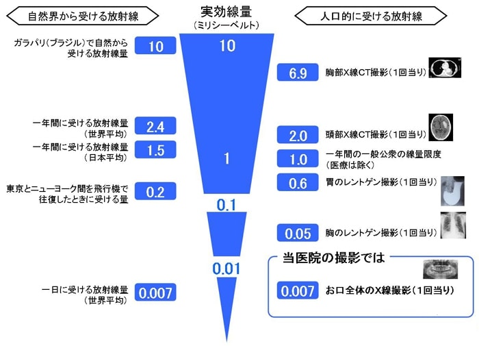 ※フィルムを使用した撮影に比べ、人体に受ける放射線の量を、約1/4~1/10に抑える事が可能です。